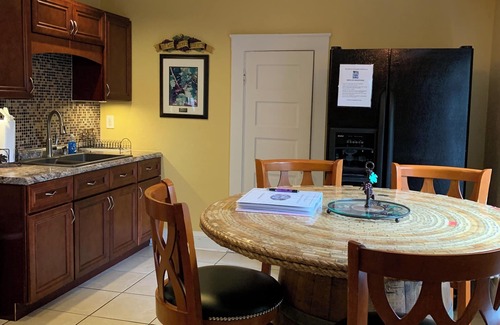 La cocina de tamaño completo con comedor está equipada con todos los electrodomésticos, utensilios de cocina, ollas y sartenes, platos y para preparar sus propias comidas caseras. El comedor ofrece el entorno perfecto para disfrutar de una copa de vino en la mesa de iluminación con poca luz y la mano hecha a mano creada con un barril de vino y de vino corchos!