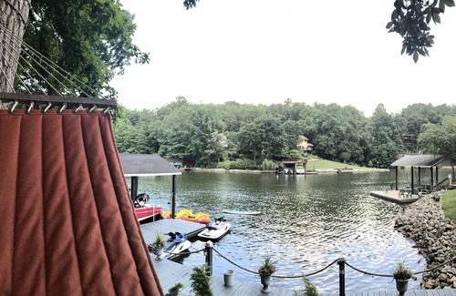 Muy privado, enclavado en el bosque. ¡Una casa de cuatro baños (dos son suites principales) y cuatro baños que está literalmente a pasos del hermoso lago! Perfecto para vacaciones familiares múltiples. Gran comedor abierto y sala de estar con techo de catedral con vistas al lago. Tantos lugares para sentarse y relajarse; cubierta superior de vinilo con mesas y muebles de exterior, porche cubierto con columpios y parrilla de gas, muelle estacionario de 40 pies conectado a dos muelles flotantes con muchos asientos y un área de hamacas con arena. Amplia guarida que tiene televisión satelital HD y mesa de billar. WiFi, teatro de sonido envolvente de 85 ", sala de juegos con mesa de futbolín y juegos de PlayStation / Wii, juguetes y juegos adicionales. Hoyo de fuego, bote a pedal, jr. Paddleboard, 3 kayaks y chalecos salvavidas, flotadores, algunos equipos de pesca incluidos. *** Nuevo para 2018 ... Alfombra de agua para siete personas. (Horas de entretenimiento para los niños !!