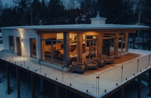 The property is an all-white, contemporary panoramic chalet with a fully glazed living space. It is perched at the top of the mountains with a southern orientation, it offers you a bright view of the nature of Tremblant. With a fully glazed living space (50 linear feet). It offers you a 360° view of the Tremblant forest.