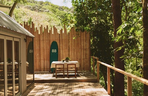 The home is fully functional and beautifully designed, creating a comfortable and cosy stay. The space has a queen size bed with linen bedding, storage underneath the bed, a fireplace, a shower with a view, vanity, toilet, kitchenette, an indoor dining set option, opening to a large deck with table and chairs, outdoor umbrella, two deck chairs, an outdoor bath, and a surfboard on offer.