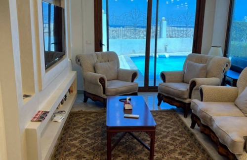 Relax and relax with your family in this quiet place with a private pool, a Jacuzzi, a sea view just five minutes from Sharm el-Sheikh airport and in front of Soho Square within a distinctive tourist resort with five swimming pools and large and clean, with all the services of a supermarket, pharmacy and other shops, with all the services, a magnificent beach with all the services and the villa is equipped with all the means of living and a good facility and a large number of individuals, which makes it suitable for families, friends, fully air-conditioned, with a private garage The property consists of three floors in the ground floor living rooms, a guest bathroom, a fully equipped kitchen, an outdoor area with a session, a barbecue area, a swimming pool, a garden and the first floor three bedrooms, a bathroom full of sea, the swimming pool, the second floor, two rooms, a bathroom and an open space with a sea view, then the roof and the whole air-conditioned property