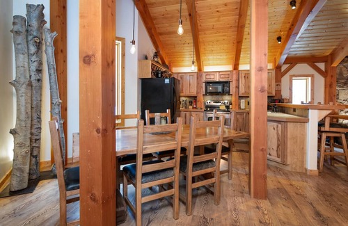 La sala de estar es espaciosa, con techos abovedados, cerchas de madera expuesta y una hermosa chimenea de gas de roca de río a piso y techo y cómodos sofás para relajarse mientras disfruta de las vistas a través de los grandes ventanales. También hay un televisor de pantalla plana para ver una película o tus programas favoritos mientras disfrutas de la compañía de tu grupo. El comedor adjunto tiene una bonita mesa de comedor con espacio suficiente para seis personas y hay espacio para tres más en el mostrador de la cocina.