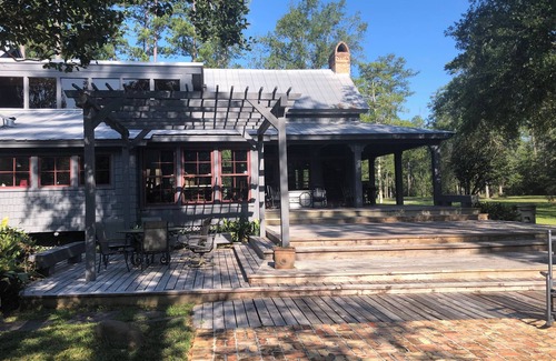 Hermosa casa aislada escondida cerca de un santuario de vida silvestre aproximadamente a 30 millas al norte de Nueva Orleans. Esta casa está ubicada en 40 acres en Bayou LaCombe. La casa tiene un gran porche con mecedoras para disfrutar de la paz y la serenidad que ofrece esta propiedad. También tiene un gran porche en la parte trasera de la casa ideal para el entretenimiento al aire libre o simplemente para relajarse. El porche tiene una mesa y asientos para seis. La casa tiene un plano de planta abierto con una decoración rústica pero elegante. Hermosas vigas de madera a la vista, pisos de madera y grandes viudas abiertas alrededor de la sala de estar y el área de la cocina. La cocina es espaciosa con todos los lujos, incluyendo encimeras de granito, hornos dobles y un comedor con capacidad para ocho. El salón incluye una chimenea con cómodos asientos alrededor y adyacente hay una gran sala con mesa de billar y TV de pantalla plana. Además, hay una sala de sol con un sofá cama que puede acomodar a dos adultos y un televisor.