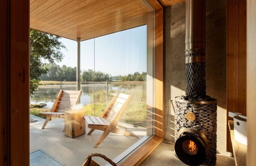The sauna accommodates 7 adults comfortably, offering views over the patio and coast through its floor to ceiling glass front. The excellent carpentry and thick wood planks follow the high standard already set by the rest of the property and the large wood fired stove is plenty powerful to provide an excellent steam for a sauna even of this size.