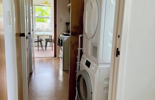 This charming space features a comfortable king-sized bed in the bedroom, providing a cozy retreat for a restful night's sleep. The dining area offers a pleasant spot for enjoying meals, with ample space to sit and dine comfortably. In the living area, large glass windows flood the space with natural light, creating a bright and inviting atmosphere. Additionally, a designated laundry area ensures convenience and efficiency for all your laundry needs.