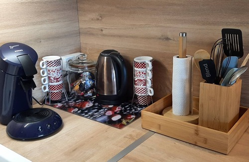 La cocina está equipada con horno, placa de cocina y frigorífico, además de cafetera y tetera, hervidor eléctrico y microondas. Y como hay una lavandería en los alrededores, no necesitarás llevarte mucho equipaje.