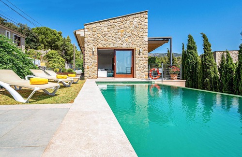 La luminosa casa de vacaciones en el borde de este encantador pueblo de montaña impresiona con su típica fachada de piedra mallorquina. Debido a su ubicación en la ladera, la entrada se encuentra en la 1ª planta. Allí se encuentra el salón con un moderno sistema de música y TV, una zona de comedor, la cocina, así como un dormitorio con baño, una acogedora terraza, la zona de la piscina y un pequeño césped. La piscina infinita de color verde esmeralda le encantará. En la planta baja, hay dos dormitorios más con 2 cuartos de baño. Uno de los dormitorios destaca por su original concepto. El cuarto de baño está integrado en la habitación y parcialmente abierto hacia arriba. Grupos (excepto familias y parejas de más de 30 años) bajo petición y con fianza especial. Número de licencia: 680/2015/ET.