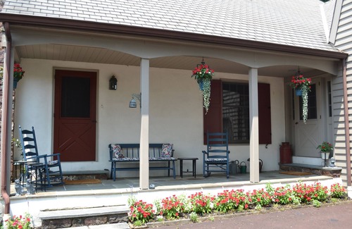 Encantadora suite de lujo amueblada con antigüedades estadounidenses y detalles que reflejan la profunda historia del condado de Bucks. El pintoresco porche cubierto conduce a tu entrada por separado. La sofisticada decoración de la sala de estar incluye sillas y muebles con respaldo de ala del siglo XVIII, una chimenea de ladrillo empotrada rodeada de estantes y estanterías empotradas, y una ventana panorámica.