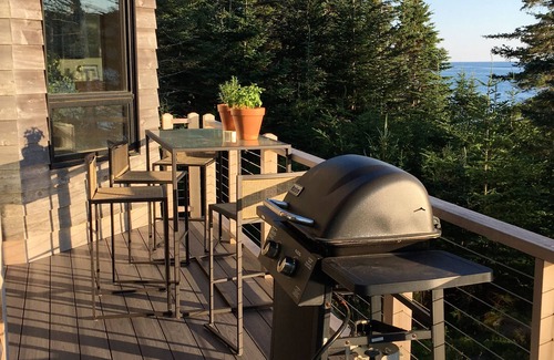 La casa en sí, moderna pero acogedora, tiene dos pisos y el diseño es perfecto para familias o invitados múltiples. En el piso principal encontrará un plano de planta abierto que contiene una sala de estar con un granito grande, chimenea de leña, un comedor formal y un rincón de desayuno, una cocina totalmente equipada y una terraza acristalada, todo lo cual, junto con con la larga cubierta a las afueras, ofrecen excelentes vistas de Frenchman Bay. A menudo podemos detectar focas, marsopas y águilas calvas directamente desde la casa. También en el piso principal se encuentra el dormitorio principal (acompañado de un baño completo), que tiene vistas al norte y al oeste del agua, así como una chimenea de gas con control remoto para las tardes y mañanas acogedoras. El área de abajo contiene la suite de invitados, que tiene su propio baño completo y una sala de estar. Un segundo dormitorio de invitados tiene dos camas individuales con acceso a otro baño completo. Entre las dos habitaciones hay una segunda sala de estar común equipada con un televisor de pantalla plana. Todas las habitaciones en el nivel inferior, con la excepción de los baños, dan a la bahía francesa. La casa también tiene un cuarto de servicio con lavadora y secadora en el nivel inferior, y medio baño en el nivel principal.