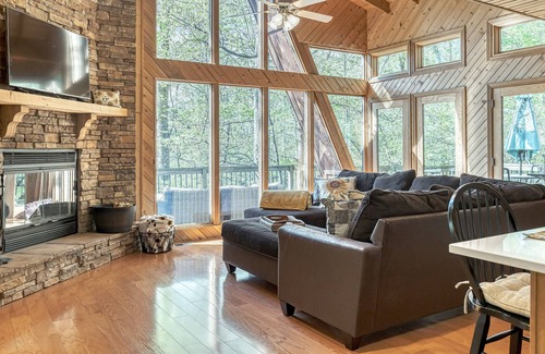 Welcome to Sunflower Valley, a sophisticated chalet tucked in the woods, surrounded by majestic oaks and blooming dogwoods in the spring. This private chalet features a great room with a floor-to-ceiling stone fireplace. The wall of windows brings the outdoors in, to enjoy four seasons of wooded beauty. Cozy but spacious, the chalet features two first-floor bedrooms, one with king size bed the other is a full-size bed, and a full bath. The second floor features a smart TV, a second bedroom with a queen size bed, and a second full bath. There are two additional single futons in the loft area that can double as comfy reading nooks.