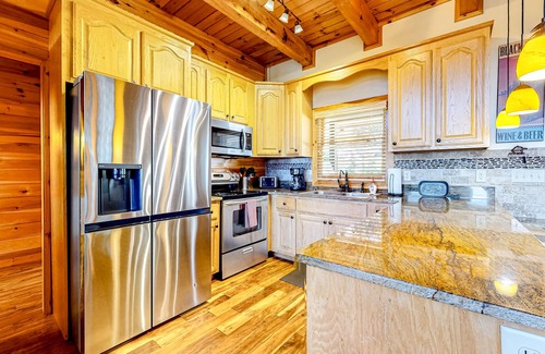 This cabin offers a wooden, sun-filled interior with high ceilings and expansive balcony views. The kitchen is well equipped with stainless steel appliances and bar and table seating where everyone can gather for a home-cooked meal. Indulge in family game night on the lower level, equipped with a pool table, streaming services for your favorite movies, and a wet bar, where you can stash your favorite snacks and beverages while relaxing in the adjacent hot tub.
