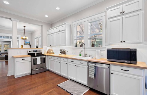 Begin your stay with a swing on the front porch bench, setting the tone for laid-back Florida living. Inside, the living room invites you to unwind with a smart TV, cozy couch, chairs, and a built-in window bench seat that’s perfect for curling up with a book. The kitchen is a coffee lover’s dream, featuring a Nespresso with pods, a DeLonghi espresso machine, and a drip coffee maker. Bright white cabinetry, stainless steel appliances, and block countertops create an airy, modern feel, while a breakfast nook with seating for four offers a cheerful spot to start your day. Gather for larger meals at the dining table for seven with a charming bench seat, or enjoy family-style dining at the spacious patio table for eight. As you step outside, the backyard becomes your private oasis. A hot tub invites evening relaxation, while the patio offers comfortable lounge seating and a covered outdoor bar complete with a grill—perfect for entertaining.