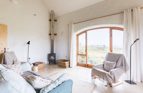 This spacious, eco-friendly holiday cottage on Strumble Head in Pembrokeshire is one of three gorgeous homes set on a smallholding. With sea views, unforgettable sunsets and oodles of green space, it’s a dream for families, couples or friends – and you’re welcome to bring the dog along, too. Walkers will love the direct footpaths from the property to the coast (1.5 miles) and surrounding villages, with the iconic Strumble Head Lighthouse just 3 miles away – don’t forget to look out for seals. For days out, Goodwick (3 miles) is packed with water sports and wildlife-watching opportunities, while Fishguard (4.5 miles) has dramatic cliffs, sheltered coves and scenic walking trails. For a beautiful beach experience, head to Pwllgwaelod (9.5 miles), a small sandy beach with views over Fishguard Harbour. Natural materials like wood, slate, lime plaster and clay paint give this eco-conscious cottage a warm and earthy charm. Step inside to a bright open-plan space that brings everyone together – the cosy lounge area has a large sofa and easy chairs by the wood burner, while the family-sized dining table is perfect for a leisurely evening feast. The one-of-a-kind, hand-built wooden kitchen is fully equipped with everything you need for meal prep, and there’s a Smart TV and stereo system for relaxing evenings in. The downstairs bedroom features two generously sized single beds and an en-suite wet room. All towels and linens are organic. Upstairs, you’ll find a king-size bed and an en-suite bathroom – please note that this room is accessed by an alternate tread staircase, which may not suit everyone. The cottage is powered by solar thermal energy and has its own private water supply. Outside, a gravel courtyard and dining area at the front of the property set you up perfectly for al fresco meals. The property is surrounded by acres of meadows and woodland to explore on foot – fab for dog walks. During your stay, you’re also welcome to roam the old Llandruidion Farm and meet the resident animals. There is private parking for 2 cars.