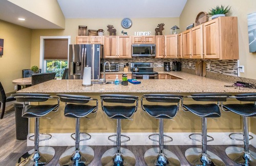 El nivel principal de la casa cuenta con un espacio de vida de concepto abierto. Una gran sala de estar con muchos asientos alrededor de la televisión de 50 ", una cocina bellamente decorada con gabinetes de arce, encimeras de mármol con capacidad para 6, así como un área de comedor con capacidad para 6. La sala de estar cuenta con cómodos asientos para que todos puedan ver el gran juego o sentarse y jugar sus juegos favoritos. El primero de los dos dormitorios en este nivel cuenta con una cama tamaño king y un vestidor. El segundo dormitorio tiene una cama queen y un walk in closet. 2 baños completos, uno de ellos en suite, completan el primer piso.