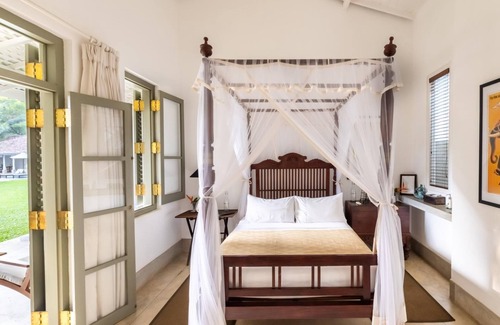 The well-preserved architectural features of our rooms retain their original colonial charm, blending traditional styles with modern comforts, for an intimate holiday at our beach-front boutique villa. A traditional four-poster double bed blanketed in plush bed linen with a vibrant throw over, takes centre stage in all our rooms together with artistic painting, amidst an earthen ambiance. Fitted with essential amenities and features.