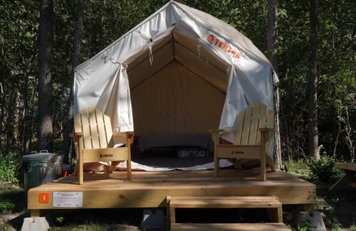 River Vista I is located in the northern section of the park approximately 5.9 miles from the park entrance. This shaded campsite is a short hike in and has vistas of the Missouri River and is situated near a kayak launch. You will be traveling over unpaved surfaces to reach the site so good tires and AWD/4WD is recommended. The site features a spacious 10 x 12 platform tent with a queen bed as well as a pop-up tent that can accommodate 4 additional campers. A picnic table, firepit, and two Adirondack chairs are also included. There is a Tentrr Loo (camping potty) at your campsite for convenience. Campers will also be able to access the nearby park bathroom with flushable toilets and sinks.