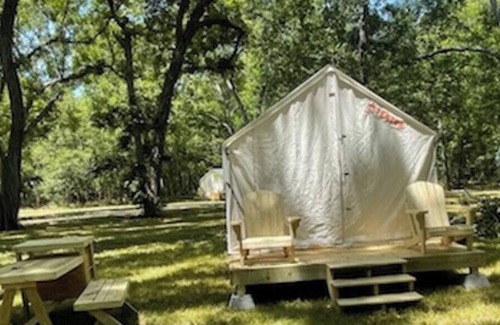 Trailside H is located 10 miles within the state park but can only be accessed by following Sawmill Road. This partially-shaded site has drive-up access for you to park and unload right by your tent. Campers may also bring their own horses for this part of the State Park offers Equestrian Camping. You'll also have easy access to River View Trail as well as Yellowstone Landing Trail. Site H is not fully secluded, there are other Signature sites around the area within 50 feet of each other. Although this is the most secluded out of the Brazos Bend sites. Your campsite features a spacious 10 x 12 platform tent with a queen bed as well as a pop-up tent that can accommodate 4 additional campers. A picnic table, firepit, and two Adirondack chairs are also included. There is a Tentrr Loo (camping potty) at your campsite for convenience. Campers will also be able to access the nearby park bathroom with flushable toilets and showers.