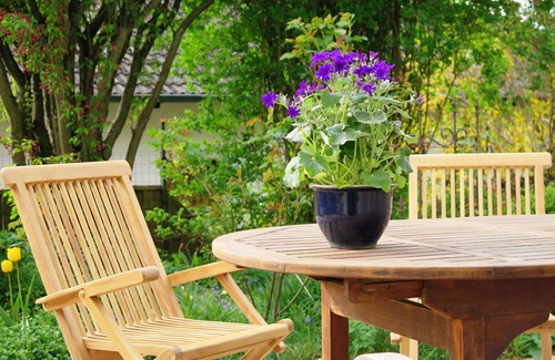 Terraza: sillas de teca, mesa y banco, una parrilla de carbón y dos sillas