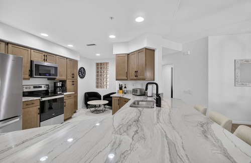 The interior of this remodeled condo features laminate and tile flooring throughout. The master bedroom has a comfortable king-size bed, the first guest bedroom has a queen-size bed, and the second guest bedroom offers two twin beds. The fully stocked kitchen includes a breakfast nook, and there is a separate dining table with seating for six. For entertainment, TVs are provided in the living room and all three bedrooms.
