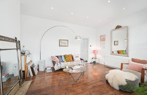 It’s the characterful wood floors that truly catch the eye in an elegant, pared-back living room that plays host to a sofa, armchair and TV. Cosy throws, vibrant soft furnishings and an artistic floor lamp help introduce a hint of hygge into this relaxing space. Retaining the calmful air with its clean lines and pure white palette, the tranquil bedroom is equipped with a double bed, wardrobe and two mirrors. A splash of pink brings an injection of colour to the bathroom. Here, you can freshen up each morning in a spacious walk-in shower before heading out for a morning stroll to nearby Notting Hill and perhaps stopping for a spot of lunch in Golborne Road.