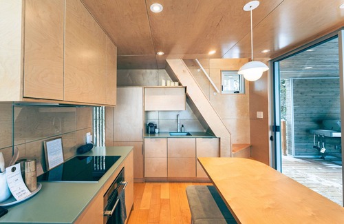 Treat yourself to one of the most lavish accommodations in Le Maelstrom, a recreational area with nature trails, bike paths, and snowshoe trails. Despite a modest building footprint of 24 square meters (the maximum allowed by zoning laws), Le DUN spares no effort to provide luxurious living within the confines of a tiny home. The master bedroom features a queen-size bed adorned with a premium Tempur-Pedic orthopedic mattress, ensuring your absolute comfort for a restful night. Fall in love with the opulent, theatrical ambiance, with its high ceilings, panoramic windows and thick, luxurious curtains. The guest bedroom is equipped with queen-size bunk beds, sleeping up to four comfortably, for a total of six guests. Enjoy year-round comfort with heated floors throughout the cabin, complemented by a central heating/cooling pump and gas fireplace, ensuring warmth and comfort on even the coldest winter days. Relaxation and Modern Amenities: Watch the sunset colors fade away while enjoying the soothing waters of the spa. The kitchen is equipped with all the modern amenities you could want: a refrigerator, freezer, dishwasher, microwave, oven, Nespresso coffee machine and luxury Villeroy and Boch porcelain tableware.