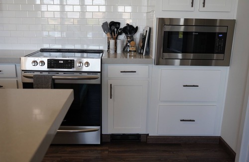 ~ A fully equipped kitchen with high end Gallery stainless steel appliances, dishwasher, oven, stove/air fryer, fridge, and microwave. A pantry that holds everything you need from a coffee machine, Keurig, tea machine with tea packets and sugar, panini maker, and more. Extensively large island with countertop seating.