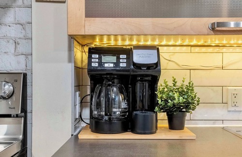 This simple one-bedroom basement suite with large windows is part of an older home with lots of character. You’ll find a cozy queen bed with super comfy pillows, a smart TV in the bedroom, and another in the living room next to the fireplace. There’s also a full workstation with a desk, monitor, keyboard, and mouse—perfect for remote work or longer stays.