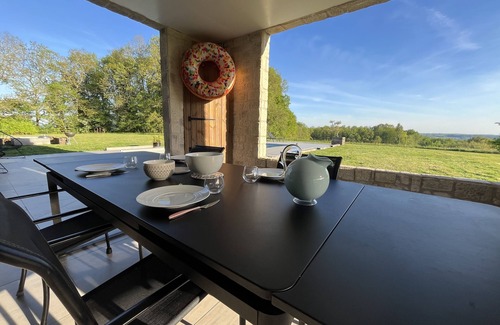 Estás aquí entre Saint Emilion y Bergerac, encaramado en la cima de las pistas, en las afueras de una pequeña aldea típica muy tranquila, disfrutando de un magnífico panorama y una exposición LLENA DEL SUR, sin frente. Reciente (2012) y perfectamente equipada, la casa, diseñada por un arquitecto de Burdeos, fue pensada como un entorno familiar / amigable ideal, combinando autenticidad, cordialidad y diseño en torno a un espacio interior / exterior único: le ofrece 260 m2 de espacio habitable en 1 hectárea de jardín bordeado por el bosque, un gran salón luminoso y ampliamente abierto en la terraza, las esquinas de las tumbonas, el comedor a la sombra, su plancha, la piscina climatizada y el diseño de la barbacoa con brasero, todos con hermosas vistas al campo, al bosque y al valle. Sin embargo, estás a solo 5 minutos en coche de todos los servicios.