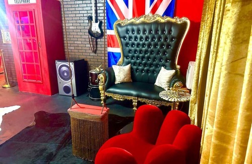 This one of a kind house is themed around some of the greatest artists in rock and roll. The Red Zeppelin Suite has a stage with microphone, Fender Strat and amp . There’s a dance pole, massage room, Purple Rain Room, pink Swifty Room, Elton John Bathroom, Elvis’s 57 Diner and The Freddie Mercury Red Room will have you humming as soon as you walk in the door. Rockstar furniture and art throughout the entire house will give you a nice break from all the cheering crowds and groupies. Rockstar rooms, your own stage, a speakeasy rockstar bathroom, a punk rock bathroom, a swing, a round bed with voice controlled lighting, a private massage room, a 50s kitchen with a retro jukebox. Heart shaped jacuzzi, thrones, guitars, Hawaiian themed patio, gold toilet, Beatles media room, a full sized English phone booth with a speakeasy secret door. Unique chairs, large TVs, smart lighting, and do much more The entire house is for your use. I travel frequently but live nearby. I’m available to help regardless of where I am The Rockstar Retreat is hidden in a quiet neighborhood but just a few blocks from the freeway and beltway. Galveston is less than half an hour away. Downtown is 20 minutes.Hobby airport 10 minute drive.