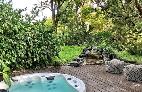 Our home sleeps 10 in beds* with 4 large bedrooms, 5 1/2 bathrooms, 7 fireplaces, library, sunroom, bar, swimming pool, hot-tub, private creek, veranda and a nearly 2,000 sf courtyard. One of the bedrooms is detached from the home and offers another layer of seclusion and escape. This room is fitted with a sitting area, kiva fireplace, small refrigerator, Nespresso coffee maker, soaking bathtub and spacious shower.