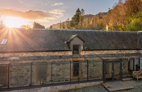 This gorgeous stone-built property, recently renovated into a contemporary home sleeping up to 10 guests, is a perfect venue for family and friends to share a holiday or mark a special occasion. Stroll through the beautifully planted, secure and private 1-acre walled garden, or take a walk through the adjoining hillside woodlands or across to the private beach on Loch Lomond for a paddle or swim. Luss (7 miles) with the streets lined with 18th and 19th-century cottages, originally built for slate quarry workers. The village's well-preserved architecture and vibrant floral displays make it a delightful place to wander. Enjoy a cruises from Tarbet (1 mile) explore the small islands of the Loch with breathtaking scenery. Originally the home of the estate manager, this property has been renovated to an exceptionally high standard, including high insulation levels and underfloor heating throughout, provided from a biomass system with continuous hot water and heating. The sitting room/party room has ceiling height into the rafters and a glazed sliding wall into the top terrace of the walled garden. It includes a warming wood burner. The separate dining room is also double height with whitewashed large dining table for 10 under a beautiful chandelier. The impressive kitchen features a breakfast island and stools. A cosy snug is ideal for a quiet retreat for a book or film with access out into the lower terrace and a six-person hot tub under a gazebo. The five fabulous bedrooms each have a distinctly Scottish theme and name. They are three king-size bedrooms each with an en-suite shower room, another king-size bedroom, and a twin bedroom. The final two bedrooms share a family bathroom, ideal for guests with children. Outside, enjoy the hot tub and outdoor dining table and benches or sit around the fire stove on colder evenings, all within the 1 acre walled garden, very secure for children or pets. Across the courtyard from the main glazed link entrance is a separate laundry room with washing machine, dryer and WC. There is parking for three cars in the courtyard entrance or additional parking just inside the entrance gates and car park area of the estate workshop.