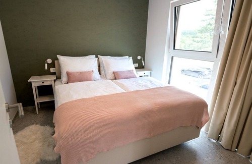 The Three Bedroom Apartment with Balcony is located on the upper floor and can accomodate up to 6 guests as it has 3 bedrooms with a lare double bed each. The balcony is perfect for lounging after using the on site pool or exploring Karst as the area has a lot to offer. The apartment is divided into two floors. The lower floor has the cosy well lit living room which is furnished with a sofa and entertainment in the form of a flat screen TV with internet connection. The same room also has the dining area and the well equipped kitchen which is equipped with an oven, dishwasher, vitro cheramic stove, coffee maker. refrigerator with freezer, and has kitchen utensils provided. Accessed from the living room are two bedrooms and a private bathroom which has a roll in shower, toilet, sink with mirror, washing machine and has small necessities provided such as shampoo, soap, towels and toilet paper.