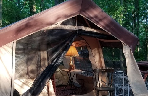 Glamping en una tienda de campaña junto al estanque. Realmente te gustará la privacidad de esta carpa de 10 X 20. Tendrás todo lo que necesitas para una escapada maravillosa. Hay una cama de espuma viscoelástica de tamaño queen que te hará dormir como un bebé. Todo lo que necesita para preparar comidas está incluido. Hay una nevera, encimera y utensilios de cocina nuwave, microondas, cafetera, platos, vasos, cubiertos, etc. La casa de baños privada está a solo unos pasos. Podrá disfrutar de fogatas por la noche y la leña es gratuita. Mientras se hospede con nosotros, tendrá acceso a nuestros Kayaks de forma gratuita. Ven y disfruta