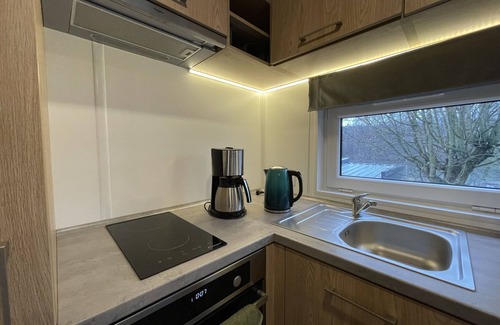 "Tiny Haus Ela", 2 estancias mobile home 25 m2. Vivienda adecuada para 2 adultos + 2 niños. Con mobiliario agradable: salón-dormitorio con 1 sofá-cama doble y TV satélite. Salida a la terraza. 1 dorm. con 1 cama de matrimonio (140 cm, 200 cm de longitud). Cocina abierta (2 Placas de inducción, hervidor de agua eléctrico, microondas, cafetera eléctrica). Ducha/WC. Calefacción eléctrica, aire acondicionado. Terraza. Muebles de terraza. A tener en cuenta: casa para no fumadores. Detector de humo.