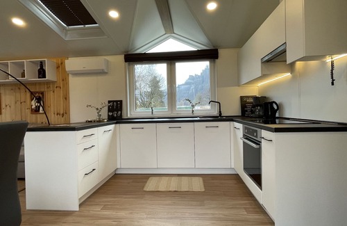 "Tiny Haus Prinz Ludwig", 3 estancias mobile home 48 m2. Vivienda adecuada para 2 adultos + 4 niños. Con mobiliario confortable: salón-dormitorio con 1 sofá-cama doble (160 cm, 200 cm de longitud), chiminea nórdica (sólo con función decorativa), TV satélite y aire acondicionado. Salida a la terraza. 1 dorm. con 1 cama de matrimonio (160 cm, 200 cm de longitud). 1 dorm. con 2 camas (80 cm, 200 cm de longitud). Cocina abierta (horno, lavavajillas, 4 placas de vitrocerámica, hervidor de agua eléctrico, cafetera eléctrica). Ducha, WC separado. Terraza pequeña. Muebles de terraza. Vista al río. El alojamiento dispone de: lavadora. Plaza de aparcamiento junto a la casa. A tener en cuenta: apartamento para no fumadores.