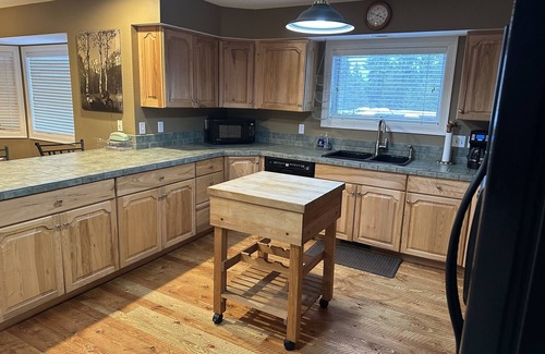 Hermosa casa personalizada, totalmente accesible para discapacitados, y completamente amigable para los niños. Sus perros también son bienvenidos, con un área cerrada fuera de la cubierta especialmente para ellos. Internet inalámbrico, cable y línea telefónica local. Relájese junto a la chimenea de gas con un libro o juegos (se proporcionan rompecabezas y juegos). O salga a relajarse en la bañera de hidromasaje integrada en la gran terraza. Duerme 10 en camas, 2 en sofá cama y 2 más pequeños en una cuna o paquete y jugar. El sofá cama está en el segundo estudio con puertas que se cierran para crear el quinto dormitorio. Mesa de comedor, mesa adicional y sillas adicionales para acomodar a todos los invitados que duermen. Solo solicite los artículos para niños que pueda necesitar: tenemos juguetes, juegos, videos, refuerzos, carriolas, etc.