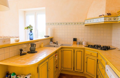 En la cocina equipada (estufa de gas, nevera, congelador, horno, lavavajillas, horno, lavavajillas, horno, lavavajillas, cafetera, tostadora, tetera y exprimidor), en colores cálidos, encontrará todo lo que necesita para cocinar buenas comidas, con colores locales, por supuesto. Gracias a sus dos terrazas dobles que dan al jardín, la cocina y la sala de estar son muy luminosas y dan la sensación de estar viviendo al aire libre.