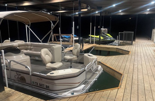 There is a huge living area downstairs and a large sitting area upstairs both with a huge comfy couch if needed for extra space for guest who don’t require much privacy. Another asset of this estate is the bar room with an attached bathroom, sliding door to the patio, pool table and plenty of room for conversations and games. The back patio with stunning lake views has its own fire place, plenty of patio furniture and built in grill/smoker. Down the path to the lake you will find the boat house, upstairs is equipped with two of the queen beds, full kitchen, bathroom with shower, sitting area, and patio. On the boat dock there are patio chairs, fish cleaning station and small kitchen and table inside on the lower level. There is also watercraft consisting of a pontoon that can be rented at an additional charge for a great time to enjoy the lake at its best. Contact renter for fees for pontoon rental). Some fishing equipment such as poles are available for use as well. Whether you're relaxing in the AC, enjoying the fireplace on the back patio, or having fun in the sun on your own private lake this wonderful property has everything you need for a comfortable and entertaining stay. Catch some racing at Xtreme Raceway Park just 5 miles away, run into Ennis for food and shopping just 15 miles away or go visit all the things Dallas has to offer just 30 miles away. What a great place to stay and chill tucked away to yourself with private gates or go visit neighboring cities and enjoy the city life. A great place to call homebase while you're away, we hope you enjoy your stay.