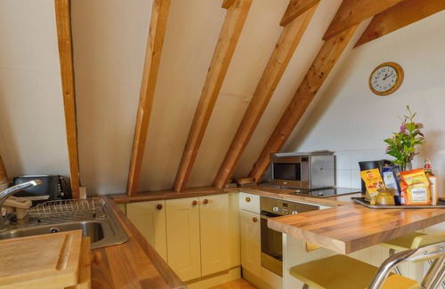 The Studio es una propiedad unifamiliar en el primer piso en Stoke Trister, Somerset, que domina el exclusivo Blackmoore Vale. Tiene un tramo de escalones de madera que conducen a un balcón y, a través de un juego de puertas de vidrio, a una sala de estar de planta abierta y una cocina equipada con una barra de desayuno incorporada. Tiene un dormitorio con cama extragrande y un aseo con ducha separado. En el exterior hay un balcón con muebles y uso compartido del jardín y la barbacoa del propietario. El aparcamiento está disponible cerca de la propiedad. El estudio es la propiedad aislada ideal para unas vacaciones románticas.