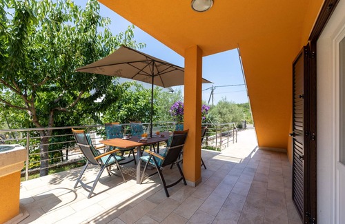 Apartment can accommodate 5 guests. Beds are situated in 2 sleeping rooms, but also in the living room, within 50m2. Guests can use a private terrace to enjoy the warm summer evenings. Food can be prepared using barbecue which is shared with other guests too. Shared pool is on disposal during stay.