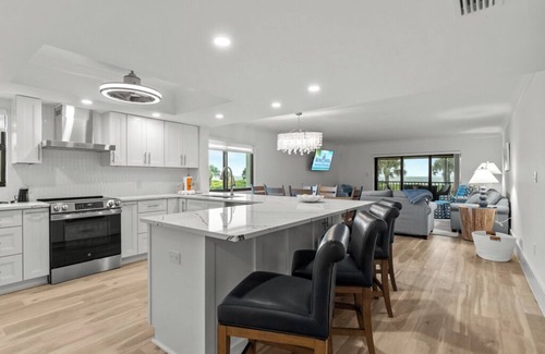 Inside, there's room for everyone to unwind, with a spacious king suite, a cozy guest bedroom with a queen bed, and a comfy queen sleeper sofa — sleeping up to six guests with ease. The fully equipped kitchen makes beach-day meals simple, and in-unit laundry adds convenience, allowing you to focus on having fun.