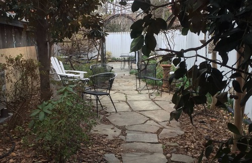 Renovado en 2015 y bellamente decorado, esta cochera de entrada independiente tiene pisos de madera, techos altos y todo lo que necesitará para su estadía en la colina. El dormitorio tiene una cama queen size de cuatro columnas, tocador, tocador de mármol y un sillón acogedor. Las puertas francesas se abren a un jardín secreto, el lugar perfecto para disfrutar del desayuno. El baño está hecho en travertino cremoso con una gran ducha de azulejos. La gran sala tiene una cama de día con una cama nido oculta, dos sillones, una barra de escalera y un televisor de pantalla plana y una mesa antigua multifunción: escondido en una alcoba, es el espacio ideal para comer un sándwich, trabaje en su computadora portátil o cargue sus dispositivos electrónicos. A la hora de comer, sáquelo de la pared y levante los lados para obtener una mesa con capacidad para seis. Háganos saber cuántas sillas de comedor tipo bistro necesitará. A lo largo de la pared posterior, la cocina totalmente equipada tiene una estufa de 4 hornallas, fregadero y refrigerador de 5 pies. Se incluye estacionamiento fuera de la vía pública para un automóvil. No hay lavadora / secadora en el apartamento, pero hay una lavandería a 7 cuadras de distancia.