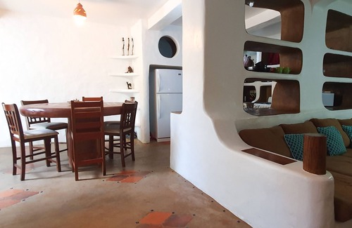• Cocina totalmente equipada en estilo estantería abierta de adobe.