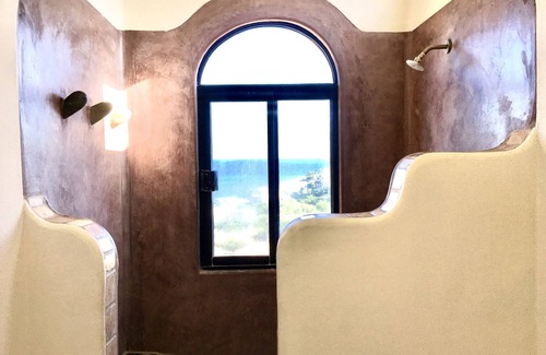 La casita cuenta con espectaculares techos altos y ventanas arqueadas. Los azulejos lisos de Saltillo añaden encanto y belleza mexicanos.