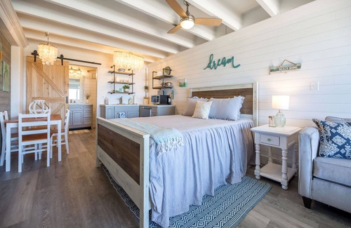 ¡Si estuvieras más cerca del Golfo, estarías en el agua! Este "Surf Style - Beach Shack" se encuentra directamente en la arena con una prístina playa sin desarrollar hacia el este, y ofrece vistas despejadas del Golfo por millas. Completamente remodelado en 2019, todo en esta unidad es completamente nuevo. Techos abovedados en todas partes, baldosas y pisos de diseño, gabinetes personalizados y encimeras de concreto personalizadas únicas (asegúrese de preguntar sobre esto, tenemos un poco de historia "salpicada"). La cocina cuenta con estanterías abiertas, placa de inducción, microondas, cafetera y todo lo esencial para que su estancia sea como en casa. Cama tamaño queen hecha a medida con ropa de cama nueva y colchón de espuma de memoria de primera calidad para un "descanso en la playa" relajante y relajante. La sala de estar con sofá cama y televisor de pantalla plana ofrece vistas infinitas del Golfo.