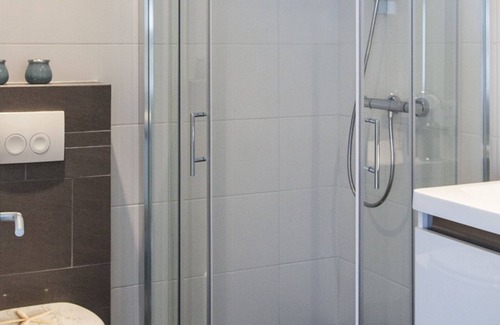 Hay un baño moderno. El baño tiene un inodoro, cabina de ducha grande y lavabo con cajón. Se proporciona un secador de pelo.