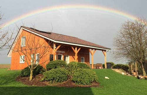 La terraza en la vertiente suroeste (50m²) ofrece una magnífica vista sobre el jardín bien cuidado y de la granja. ubicado en el sitio de una gran variedad de juegos para niños - Bolzfläche, jugar granero, pista de carreras Bobbycar, caja de arena y un barco pirata ... También somos una pequeña granja con cerdos, pollos, caballos, gatos y conejos - la bienvenida a ser vistos y acariciaba.