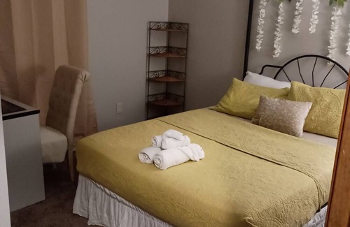 Spend your nights in a lovely vacation home with 2 bedrooms, and private bathroom, shared kitchen and living room, garage and a fenced in backyard with a storage building. It's located in a safe quiet neighborhood and children and small pets are welcome.
