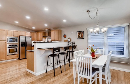 Además de la mesa de la cocina con capacidad para 6, hay 3 taburetes en la barra de la cocina. Un comedor separado también tiene capacidad para 6 personas en una gran mesa de vidrio. Tanto las mesas de cocina como las de comedor se pueden ampliar.