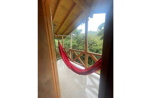 Cuenta con una cocina dotada, cama doble sofa cama, comedor chimenea de leña y dos balcones grandes, internet de alta velocidad para que puedas trabajar en medio del bosque cuenta con parqueadero privado y muy buena privacidad, excelente zona verde y amplios bosques para hacer caminatas ecologicas.